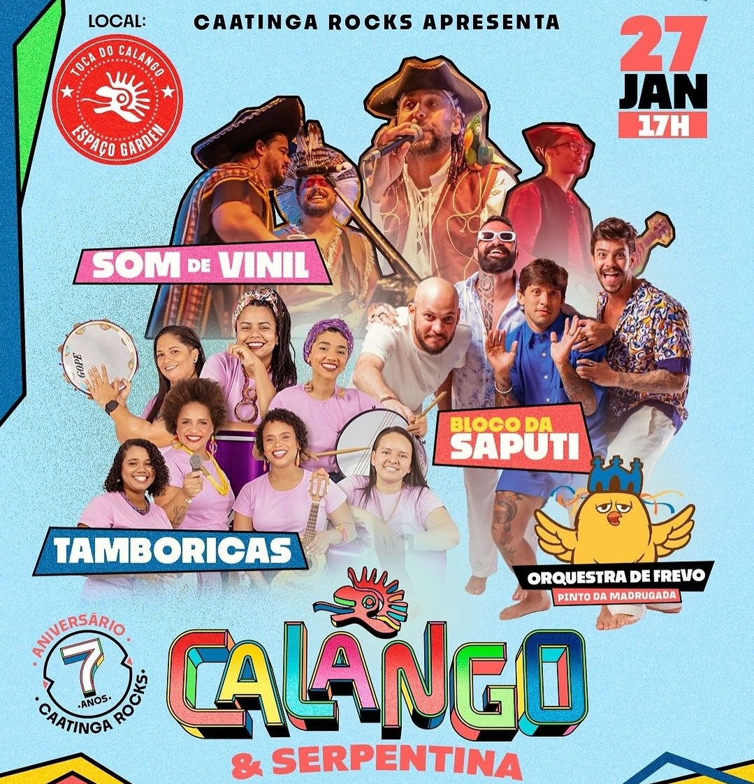Quem vai animar a festa Calango e Serpentina é Som de Vinil, Bloco Saputi, Orquestra de frevo Pinto da Madrugada e Tamboricas.