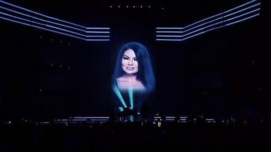 "Olá, meu povo. Tudo bem com vocês? Há 20 anos eu estava aqui, cantando na gravação do nosso primeiro DVD. Mas hoje, vocês é quem serão a minha voz", diz a imagem projetada de Paulinha Abelha no telão no meio do palco.