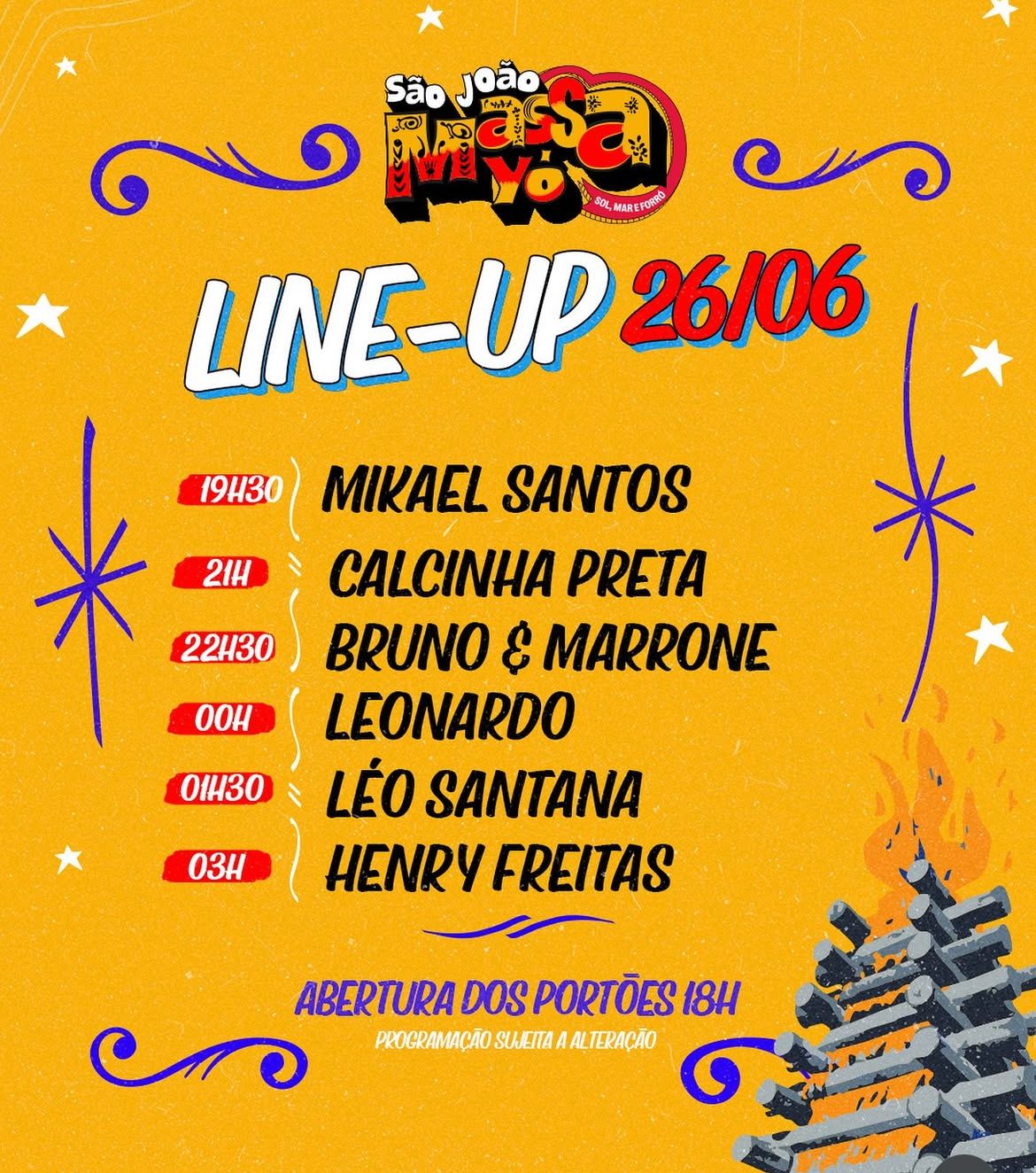 A quinta-feira (26) mantém a animação do São João Massayó 2025. A partir das 18h, sobem ao palco Fidellis, Bruno & Marrone, Leonardo, Léo Santana, Simone Mendes, Henry Freitas e Calcinha Preta.