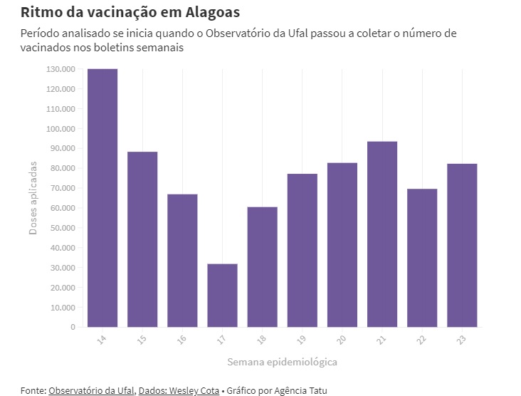 “Como cada pessoa deve receber duas doses, a vacinação da população adulta de Alagoas precisa de 4,4 milhões de doses. Subtraindo o que já foi aplicado, obtemos quantas doses ainda faltam. Por fim, foi dividido esse número pela quantidade de doses aplicada naquela semana”, explicou o coordenador do Observatório, Gabriel Bádue.