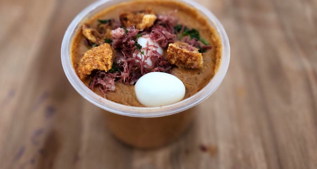 Caldinho de feijão com torresmo, charque e ovo de codorna