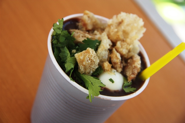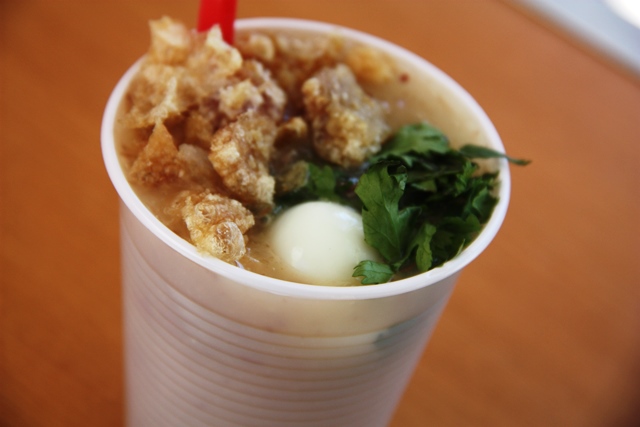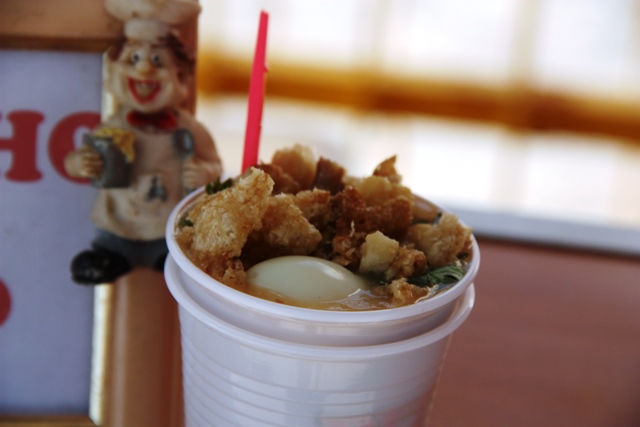 Atoladinho – Um creme de macaxeira com charque desfiado, sal na medida certa, torresmo, ovo de codorna e cheiro verde.