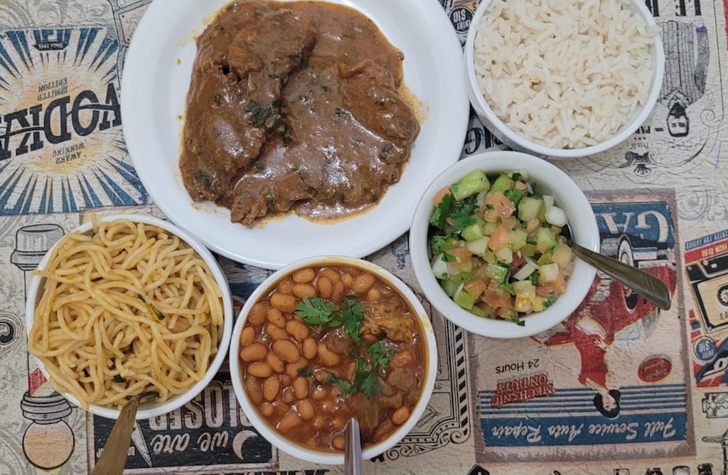 Carne do sol com feijão tropeiro, macarrão, vinagrete e arroz tem de segunda a sábado