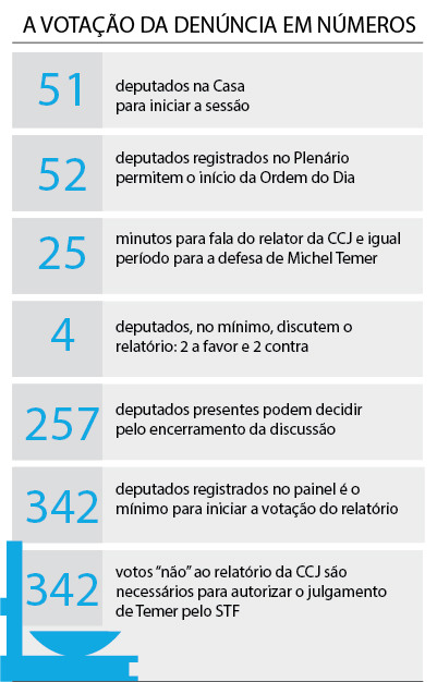Durante a votação, os parlamentares vão se pronunciar sobre o relatório do deputado Paulo Abi-Ackel (PSDB-MG), que pede a rejeição da denúncia. Portanto, no momento da votação, os deputados favoráveis ao afastamento de Temer devem dizer "não" ao relatório e os contrários à saída de Temer precisam dizer "sim" ao parecer.