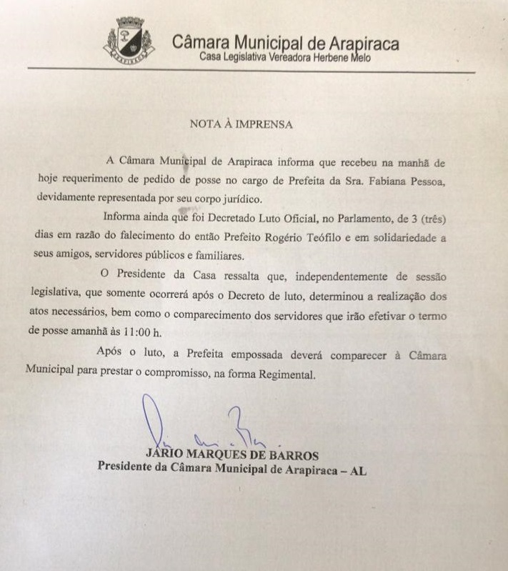 Na nota, ficou marcada para às 11 horas desta terça a cerimônia de posse, mesmo com o decreto de luto.