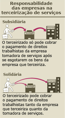 De acordo com o texto dos senadores, quanto às obrigações trabalhistas haverá a responsabilidade subsidiária da empresa contratante em relação à responsabilidade da empresa de serviços terceirizados. Parecer unânime aprovado pela Comissão de Trabalho, de Administração e Serviço Público mantém a responsabilidade solidária, conforme texto da Câmara. As mudanças ocorrem na Lei 6.019/74.