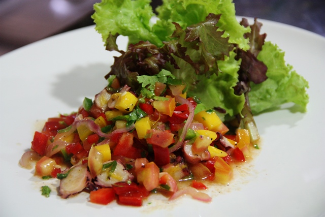Flor de Lotus – A combinação do suco de limão e laranja é prefeita para quebrar a acidez do ceviche de polvo. O crustáceo é cozido, textura macia e servido com manga e legumes bem cortadinhos e salada. Entrada leve e saborosa.