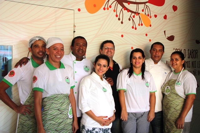 Moema Ferro grávida de Joaquim e parte de sua equipe do restaurante Manga Verde: Aedja, Eduardo, Cicero, Claudia, Fabiano, Janilson e Patricia