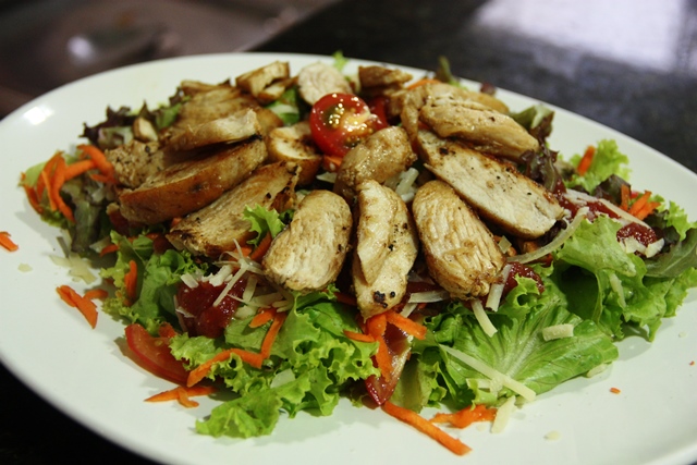 Gardênia – 100 gramas de filezinhos de frango grelhado com mix de folhas, tomate, cenoura ralada, lascas de queijo de parmesão. Mas a vedete da salada é o chutney (molho de origem indiana) de tomate, ele é elaborado no vinagre de maça, azeite, cebola picada, alho e pimenta. Bate no liquidificador com os tomates cozidos e rega as folhas verdes.