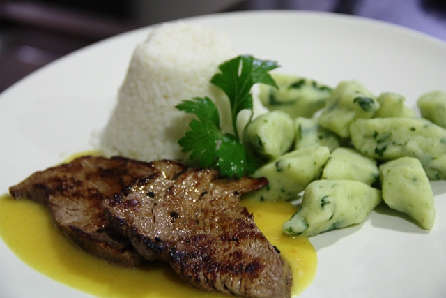 Flor de São João– A batata doce é o tal na cozinha do Manga Verde, ganhou até uma versão de nhoque com espinafre, para acompanhar filé ao molho de mostarda (ótimo) e arroz integral ou branco.