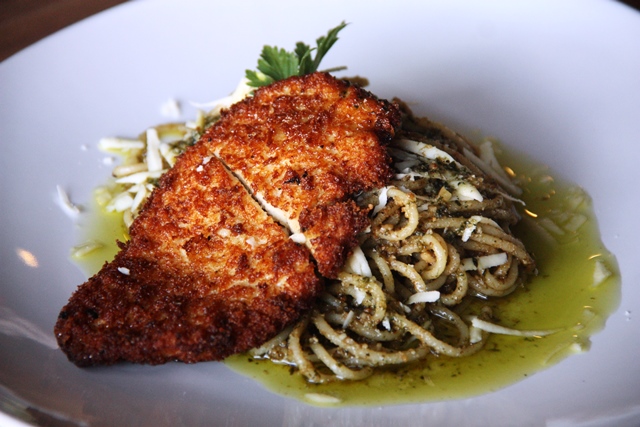 No Toscana tem almoço executivo, de terça a sexta-feira, com entrada, prato, principal e sobremesa no valor de R$ 55,00. Na foto espaguete com molho pesto e peito de frango