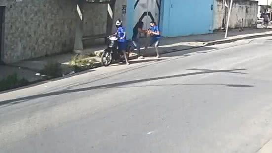 As imagens mostram que os suspeitos em uma motocicleta se aproximaram da vítima que estava sozinha, sentada no banco do ponto de ônibus. O rapaz que estava na garupa desceu do veículo e abordou a mulher aparentemente desarmado.