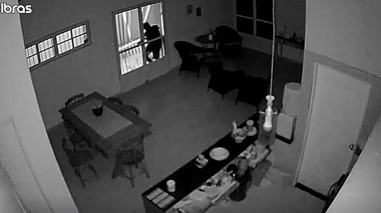 As imagens mostram o ladrão arrombando as grades de proteção da porta com força e depois quebrando os vidros. Ele entra na casa, arrasta um fogão e depois arromba uma outra porta, para fugir em seguida levando um botijão de gás.