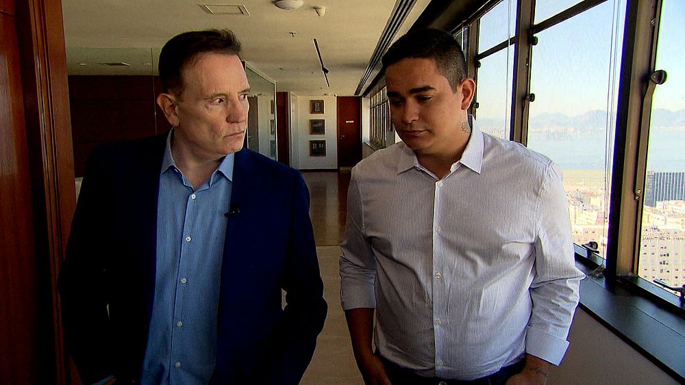 O jornalista entrevista Allan de Jesus, empresário acusado de enganar o jovem influencer. Foto: Divulgação / RECOD |