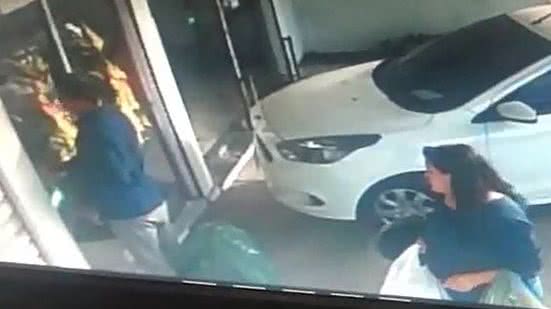 No vídeo, a mulher, que estava com um capacete em uma das mãos, bate na porta do estabelecimento, enquanto o homem aguardava ao lado, escondido da visão da funcionária do local. Após ela abrir a porta, o casal entrou na loja e o homem armado anunciou o assalto.
