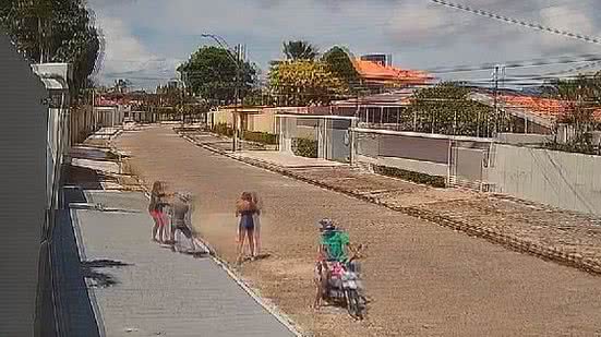O vídeo mostra a ação rápida dos bandidos. A dupla usa a moto de cor branca para se aproximar das duas mulheres, que estão em direção contrária, e o passageiro desce do veículo para pegar o celular de uma delas. A mulher ainda tenta correr, mas desiste e é alcançada.