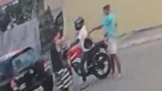 As imagens gravadas por câmeras de segurança mostram o momento em que um jovem é abordado por dois homens em uma moto. Os suspeitos apontam uma arma para a vítima e levam seus pertences.