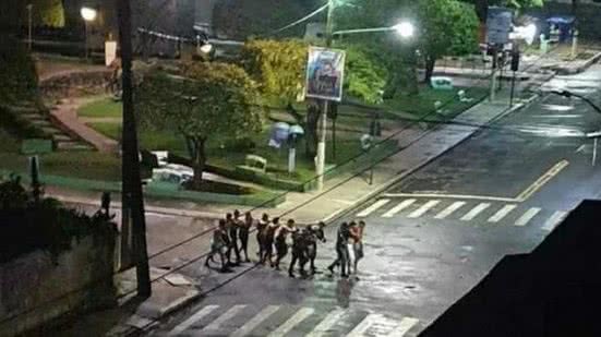 Uma das imagens mostra um grupo de ao menos dez pessoas em uma praça, supostamente conduzidas pelos assaltantes como reféns.
