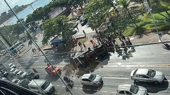 Um caminhão-caçamba carregado de entulhos tombou na orla de Maceió, no bairro de Pajuçara, após uma colisão com carro de transporte por aplicativo nas primeiras horas da manhã desta quarta-feira, 23. O veículo de grande porte ocupou parte da pista, assim como os materiais de construção, que ficaram espalhados no asfalto. Ao menos sete pessoas ficaram feridas.