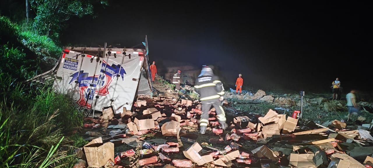 A Polícia Rodoviária Federal confirmou que o acidente aconteceu na altura do km 09 da rodovia. O caminhão transportava carga de linguiça. Imagens divulgadas pelo Corpo de Bombeiros mostram a dimensão do capotamento.