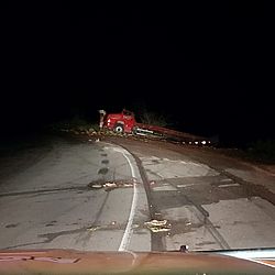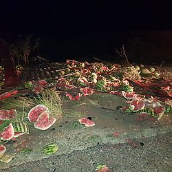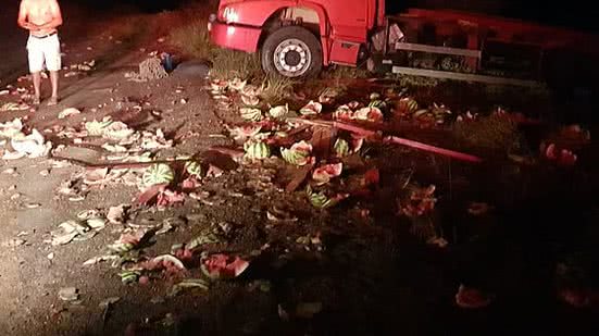O Batalhão de Polícia Rodoviária (BPRv) enviou uma equipe ao trecho do acidente e o veículo foi encontrado às margens da pista, com a parte da cabine destruída e virada para a pista. As frutas estavam espalhadas pelo chão, com grande número de melancias partidas com o impacto da queda.