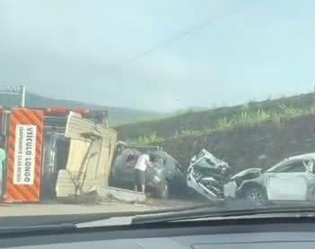 O caminhão-cegonha foi encontrado com uma lateral, do lado do banco do passageiro, junta ao chão. Também foi possível observar, em imagens divulgadas nas redes sociais, que ao menos três carros apresentaram danos e ficaram às margens da pista.