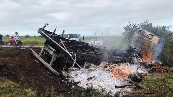 Segundo o Corpo de Bombeiros, o automóvel ficou com a carga em chamas às margens da rodovia e os militares debelaram o incêndio com o uso de água da viatura com o apoio do Auto Tanque. O caminhão ficou totalmente destruído.