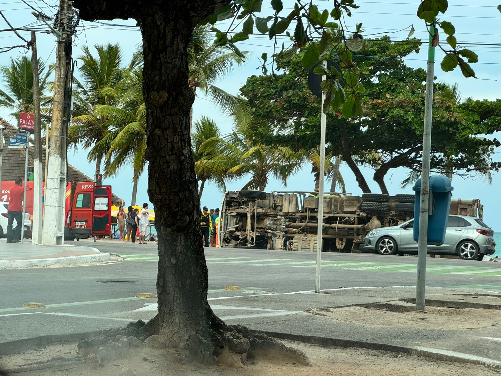 Um caminhão de coleta de lixo tombou, na tarde desta quarta-feira, 28, na avenida Álvaro Otacílio, na orla de Ponta Verde, em Maceió. Um trabalhador ficou ferido e foi encaminhado ao Hospital Geral do Estado (HGE), no Trapiche da Barra.