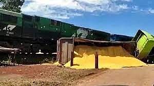 Um segundo vídeo mostra o caminhão já tombado, com a carga espalhada. "Olha o trem... acabou de bater na carreta", diz o homem que grava a cena. O acidente ocorreu por volta das 10h e a circulação foi restabelecida às 14h45 segundo a Rumo, administradora da ferrovia.