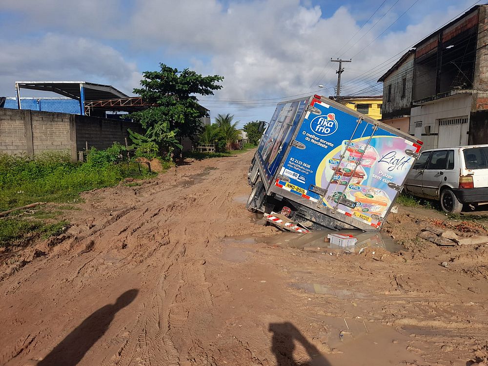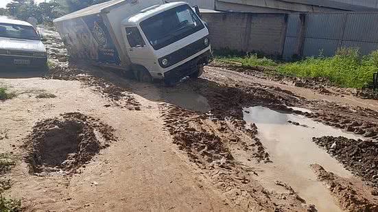 A reportagem flagrou ainda um caminhão que atolou no último sábado (14) e, devido à lama na rua, o motorista não conseguiu retirar o veículo.