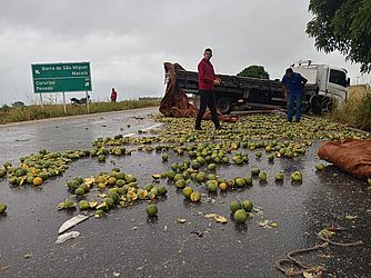 Um caminhão que transportava laranjas derrapou e rodou na AL-101, próximo ao trevo do Gunga, no município de Roteiro, na manhã desta terça-feira (31). De acordo com informações confirmadas pela reportagem do TNH1, o condutor conseguiu controlar a direção e evitar o capotamento do veículo. Não houve feridos e as frutas ficaram espalhadas pela pista.