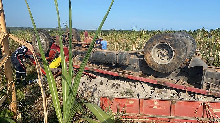 Segundo a equipe do Samu, o acidente aconteceu após o pneu do caminhão estourar, fazendo o veículo capotar.