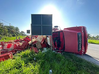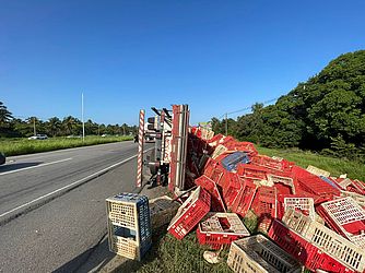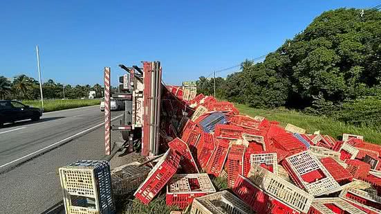 Um caminhão carregado de frangos vivos capotou na AL-101 Sul, em Marechal Deodoro, na manhã desta terça-feira, 26. O motorista sofreu ferimentos leves e não corre risco de morte.