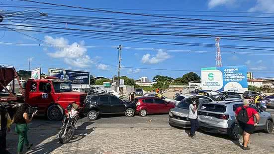 "O caminhão trator, puxando semirreboque, conhecido também como carreta, descia a ladeira Geraldo Melo carregado, em marcha baixa, velocidade reduzida. Percebeu que faltou freio e colidiu com 10 carros à frente. Uma das condutoras, a primeira que o caminhão colidiu, precisou de atendimento do Samu. Foi levada ao hospital privado. Queixava-se de dores nas costas", disse o agente Wanderson Freitas.