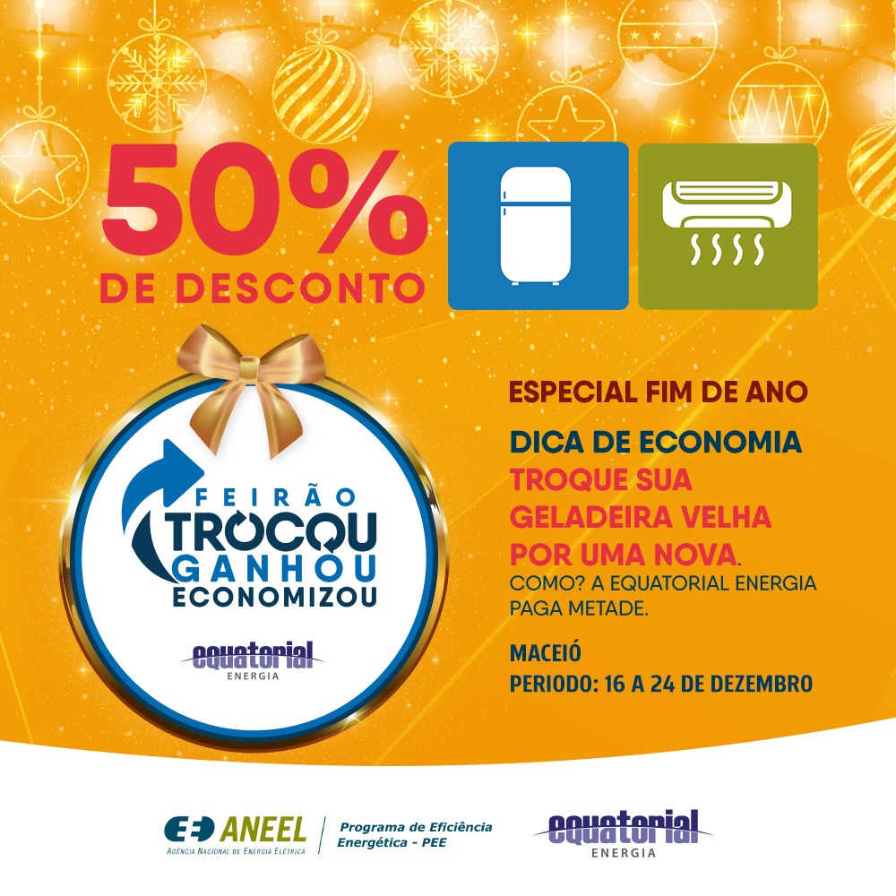 A partir desta segunda-feira (16), os moradores de Maceió poderão obter descontos de 50% na compra de geladeiras ou aparelhos de ar-condicionado. A ação faz parte do projeto Bônus Eficiente da Equatorial Energia Alagoas, no qual os clientes residenciais da distribuidora poderão substituir seus equipamentos ineficientes por novos, pagando apenas metade do valor. A campanha vai até o dia 24 de dezembro ou enquanto durar o estoque disponibilizado pelo Programa de Eficiência Energética da Equatorial.