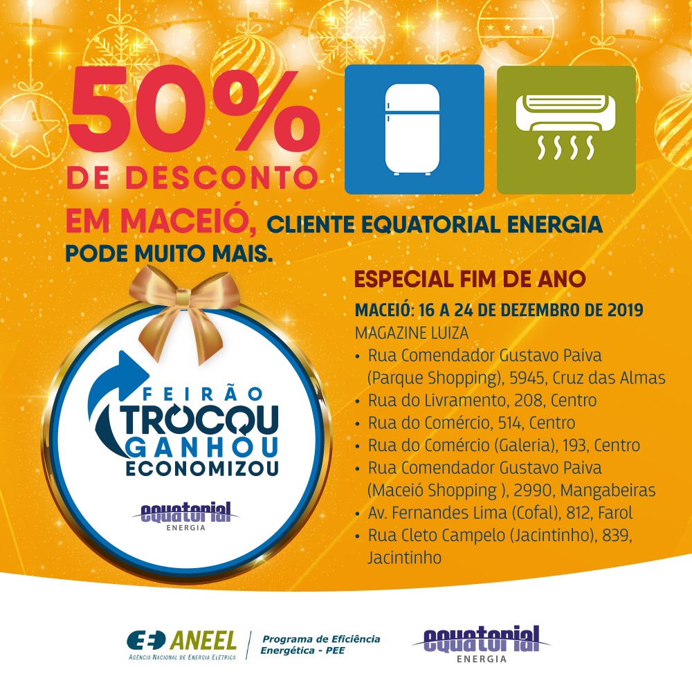 Período: 16 a 24/12/2019 (ou enquanto durarem os estoques disponibilizados pelo Programa de Eficiência Energética da Equatorial Energia Alagoas em cada loja)