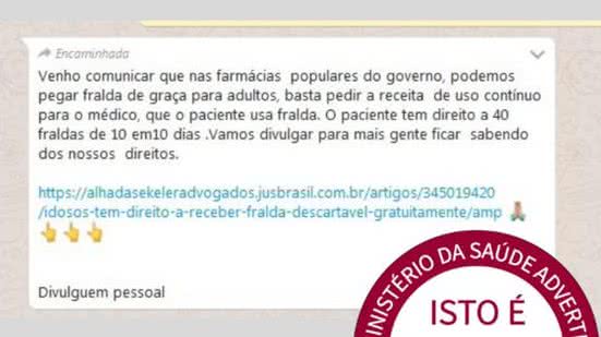 Um dos mais recentes esclarecimentos feito pela pasta foi sobre a disponibilização gratuita de fraldas geriátricas, que é falsa. De acordo com o Ministério da Saúde "a disponibilização de fraldas geriátricas pelo Farmácia Popular é verídica. No entanto, elas não são gratuitas, mas, sim, dispensadas com até 90% de desconto".