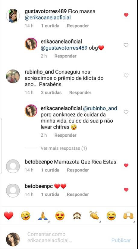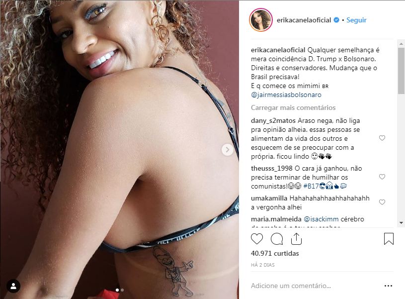Em menos de 24 horas após ter tatuado no corpo a caricatura do novo presidente da república Jair Bolsonaro, feita em homenagem para a sua posse no dia 1º de janeiro, a modelo Érika Canela buscou informações na delegacia de crimes virtuais de sua cidade, em Presidente Prudente (SP), para tentar se proteger dos milhares de ataques virtuais que tem recebido em suas redes sociais depois que publicou a foto da tattoo em seu Instagram.