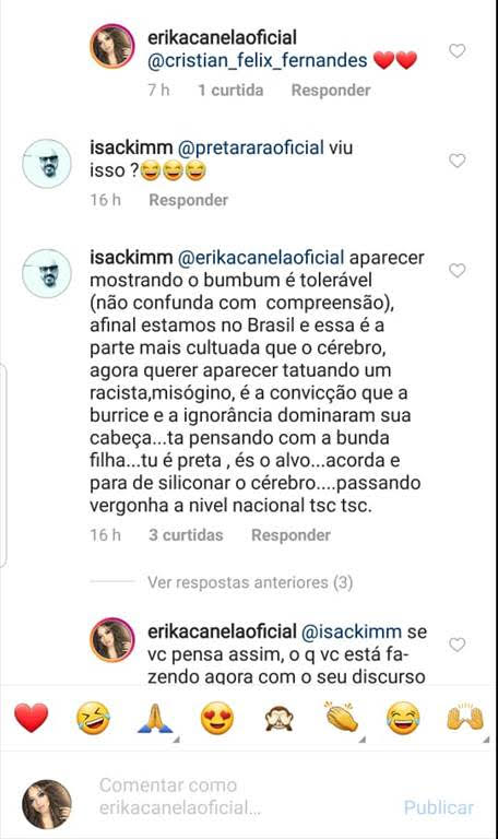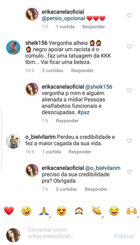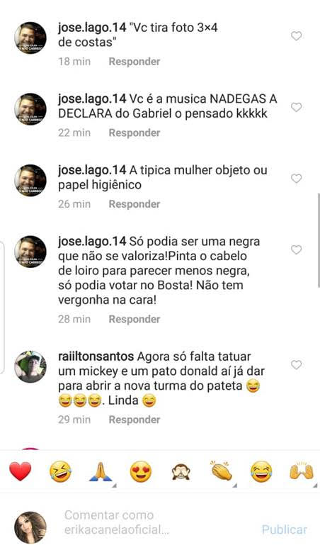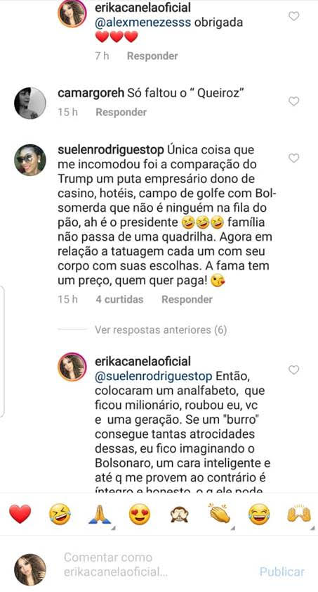 “Mulher, se um dia ele [Jair Bolsonaro] fizer mal a você, você estará com a tatuagem desse lixo no seu corpo“, comentou uma internauta em seu post. “Bolsonaro disse que o negros como você deveriam ser pesados em arrobas”, declarou outro internauta em uma outra postagem.