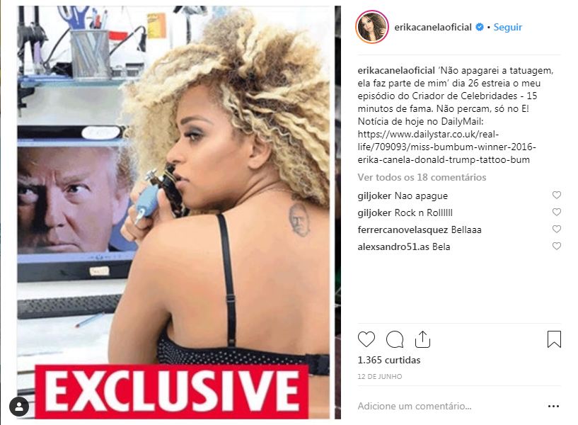 Essa não foi a primeira tatuagem polêmica que Erika fez. No meio do ano ela chamou a atenção da mídia americana após tatuar o rosto do presidente de lá, Donald Trump; veja o desenho:
