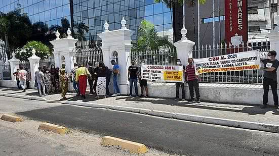 O grupo formado por candidatos aprovados no concurso público do Corpo de Bombeiros Militar de Alagoas (CBM) voltou a se manifestar contra a suspensão do certame, na manhã desta quarta-feira, 17, em frente ao Palácio República dos Palmares, no Centro da capital alagoana. O protesto aconteceu de forma pacífica, com o objetivo mais uma vez de chamar a atenção das autoridades para a revogação do cancelamento das provas.