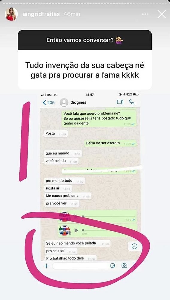 "Posta que eu mando você pelada pra todo mundo. Me causa problema para você ver. Se não eu mando você pelada pro seu pai e pro batalhão dele todo", teria escrito o cantor.