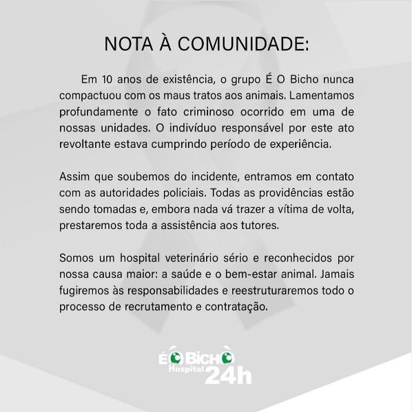 Em nota publicada na página do Instagram da clínica . Eles lamentaram o fato e disseram que nunca compactuaram com qualquer violência contra animais. Confira na íntegra: