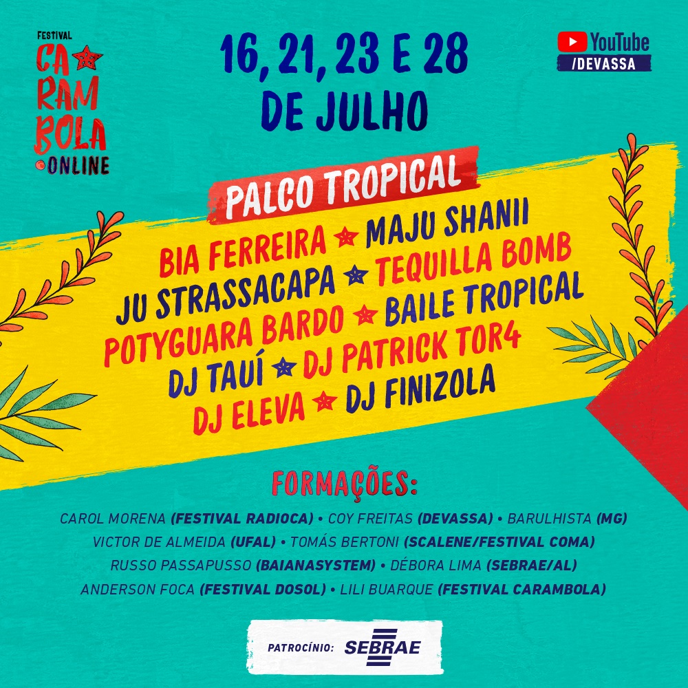 Pela primeira vez, o Festival Carambola vai acontecer totalmente online e gratuito. Em seu 4ª ano, o projeto se transforma diante de um cenário inédito e novo para todo o mundo. Se dançar dentro de casa deu certo durante o Devassa Tropical Ao Vivo, os próximos dias 16, 21, 23 e 28 de julho vão mostrar que ainda há fôlego para curtir muita música boa sem descumprir o isolamento social tão necessário no momento.