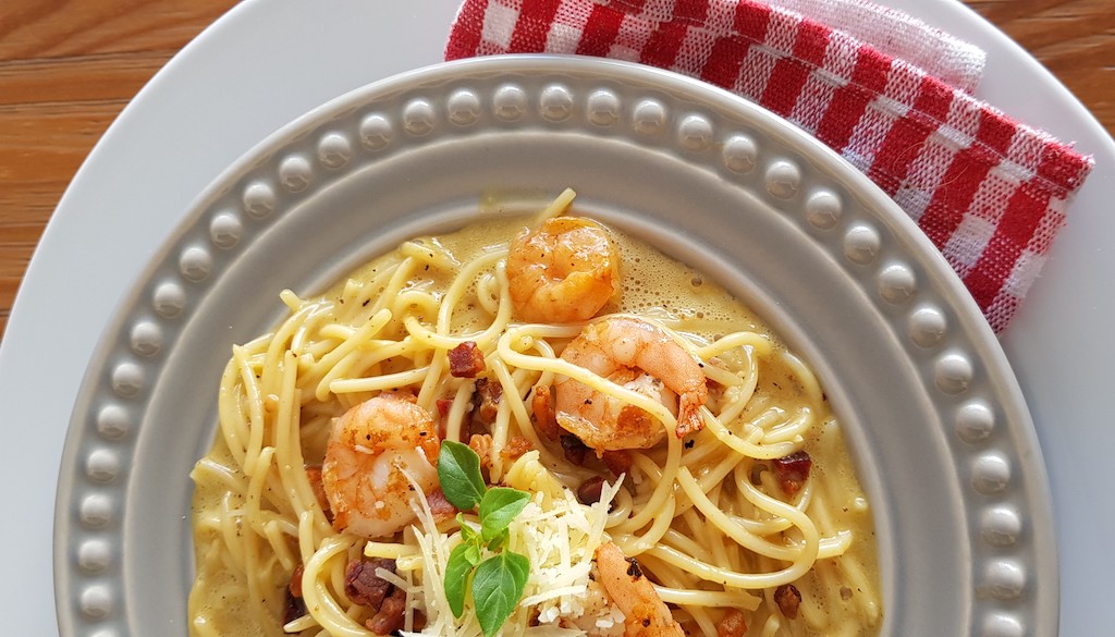 Da cozinha do chef Thiago Brandão aprecio, sem moderação, o carbonara, uma receita clássica italiana aparentemente simples, mas que requer resignação na hora de preparar a iguaria. “Importante é acertar o ponto do ovo para que fique cremoso, sem coagular a gema”, alerta o chef da Veneto Trattoria. Com camarões e minis pedaços de bacon ficou perfeito. Outro segredinho é usar queijo de primeira qualidade. Thiago não abre mão do queijo italiano (pecorino ou grana padano).