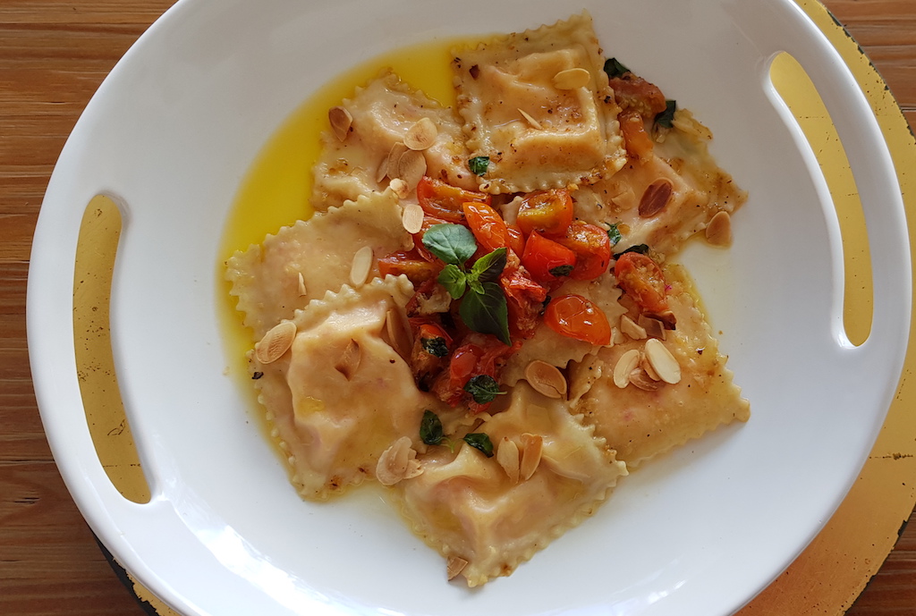 Ravioli de queijo do reino com azeite, tomates e manjericão