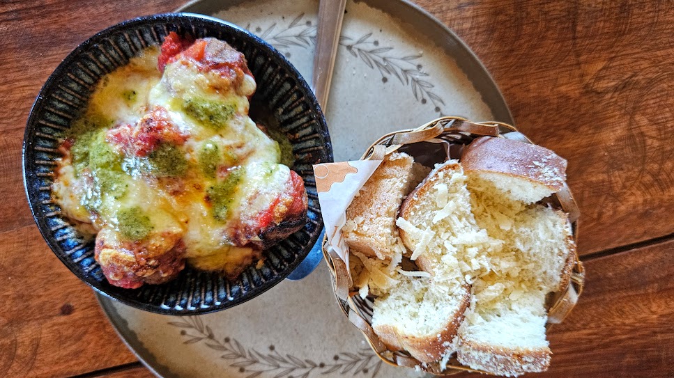 Pizza Branca com parmesão e queijo azul — uma ótima pedida para começar. Porpetta com molho de tomate e bastante queijo, acompanhada do pão de alecrim da casa.