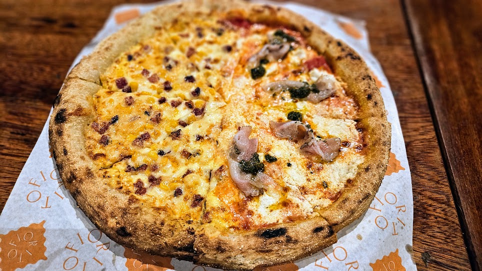 A grata surpresa foi a Pizza de Creme de Milho — feita com mussarela da casa, milho e bacon, finalizada com parmesão e um pesto de manjericão que dá o toque especial.