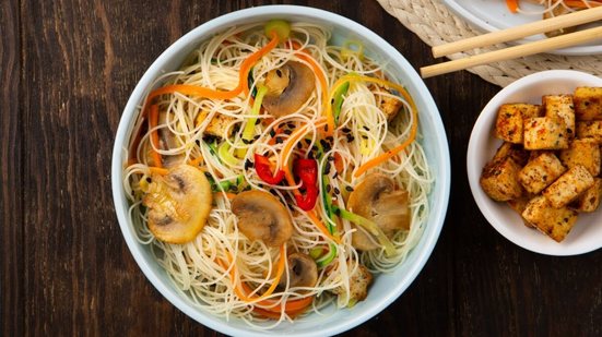 Em uma panela com água em fogo médio, cozinhe o macarrão de arroz conforme as instruções da embalagem até ficar macio, escorra e reserve. Depois, aqueça uma frigideira grande em fogo médio-alto e adicione o óleo vegetal. Acrescente o tofu e doure por todos os lados até ficar levemente crocante. Retire da frigideira e reserve.