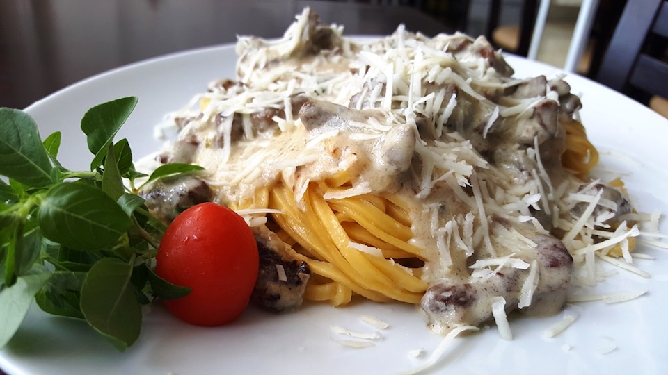 Talharim com carne de filé em tiras no molho de gorgonzola.